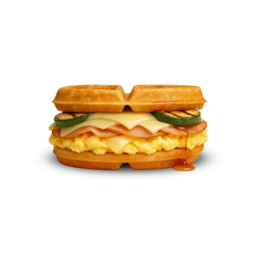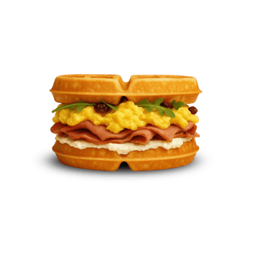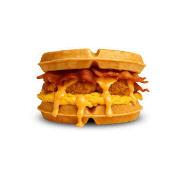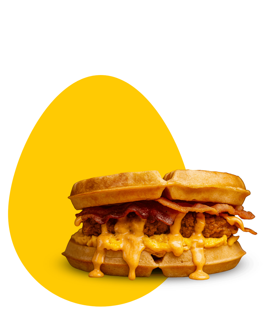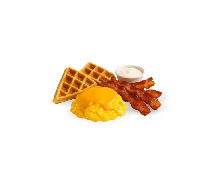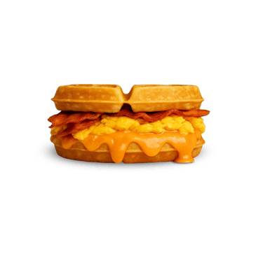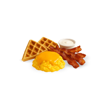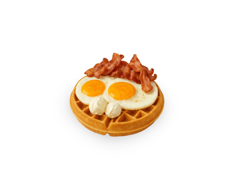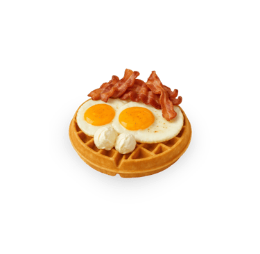 1/2 waffle, tocino crujiente, huevo revuelto y queso americano.