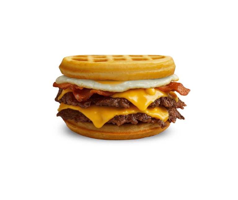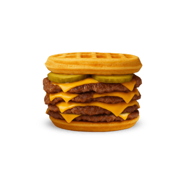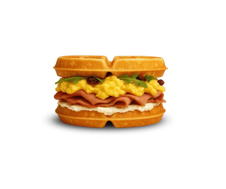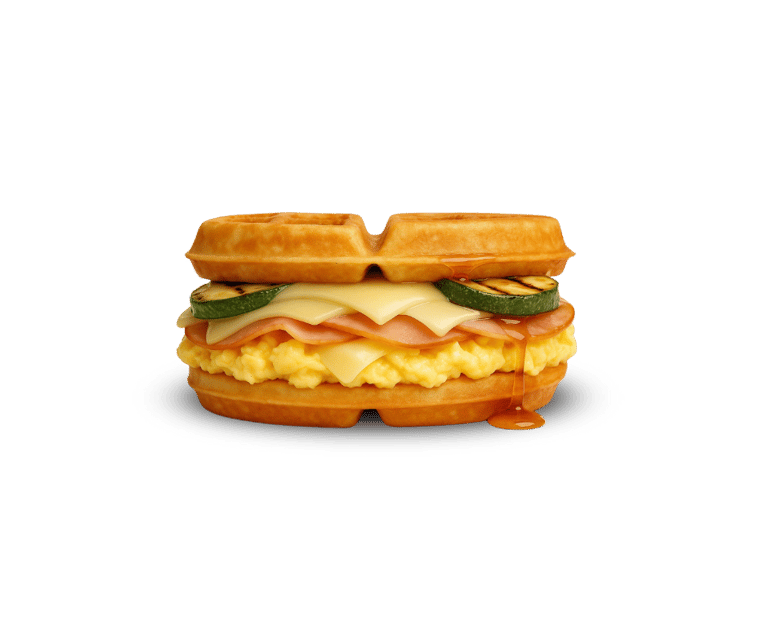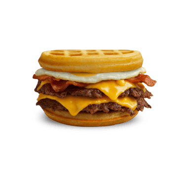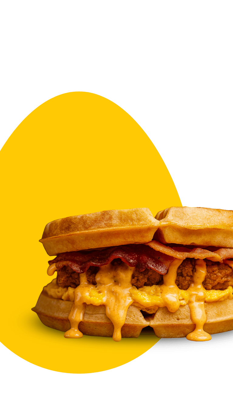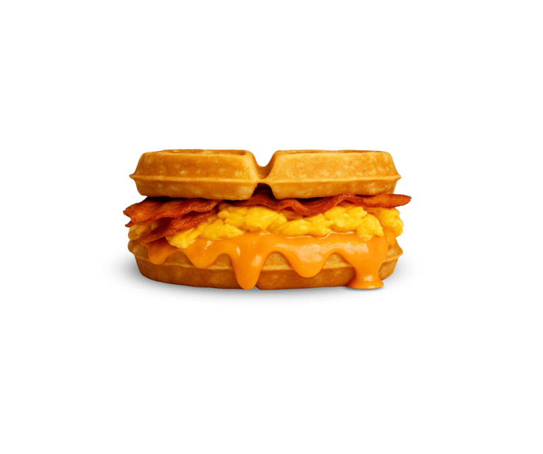 1/2 waffle, tocino crujiente, huevo revuelto y queso americano.