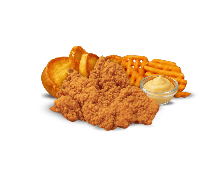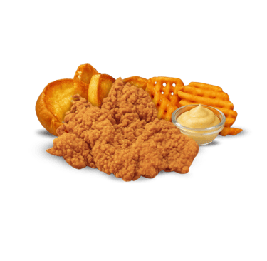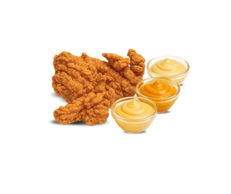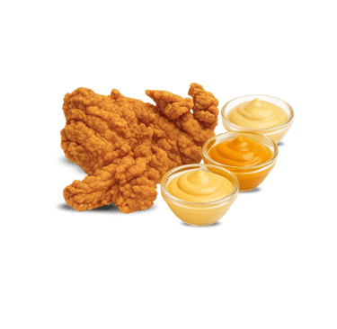 Tiras de pollo frito acompañadas con tres aderezos a elegir.