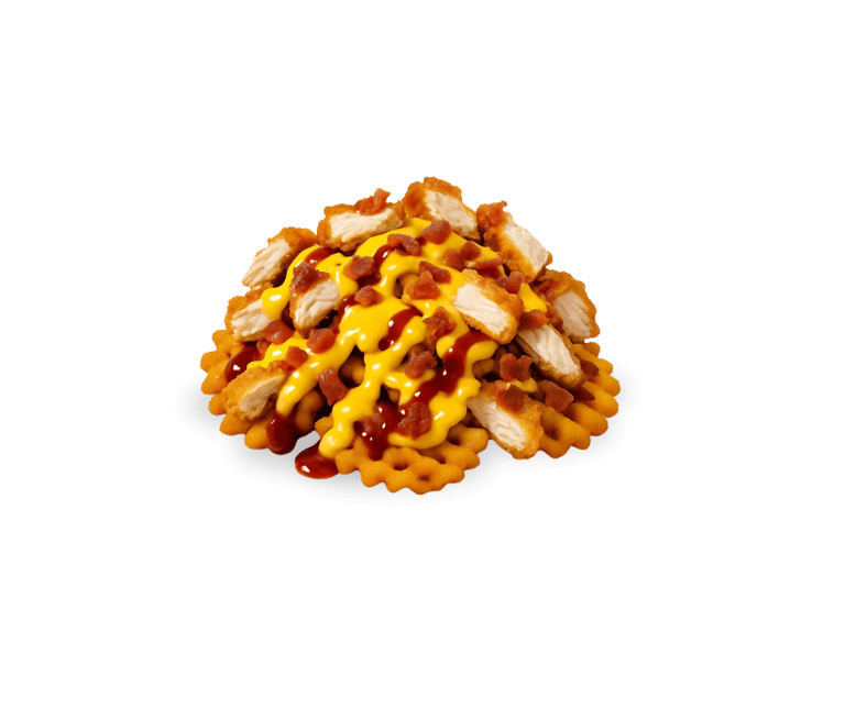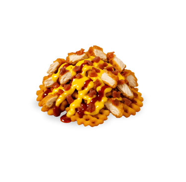 Papas waffle, con pollo frito, salsa de queso cheddar, trocitos de tocino y bbq.