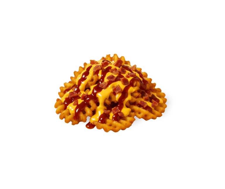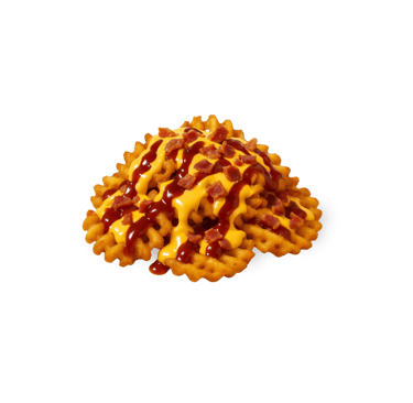 Papas waffle, con salsa de queso cheddar, trocitos de tocino y bbq.